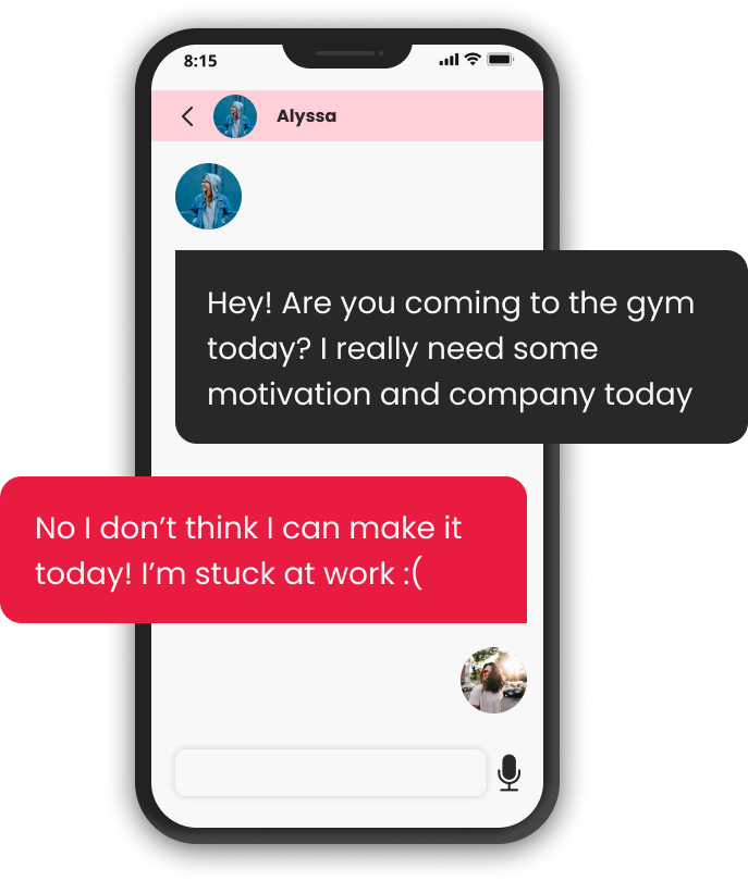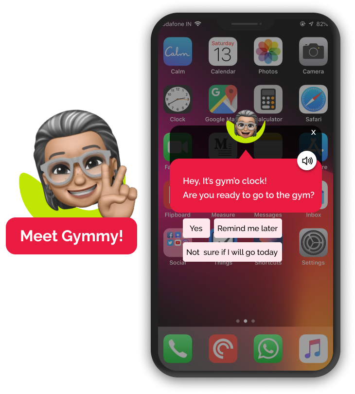 Gymmy is the AI character who with its timely nudges motivates its users. It sends quirky message nudges along with quick answer suggestions! It could also read out the message to you, in case you're too busy to look at the screen.