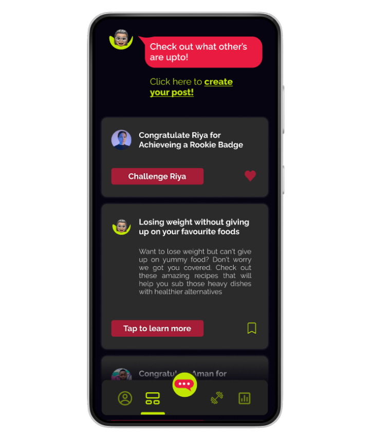 The feed lets users interact with their friends and be updated about their progress. It even lets one post their achievements and write a post. You could even challenge a friend to a fitness-duel by reacting to their post!