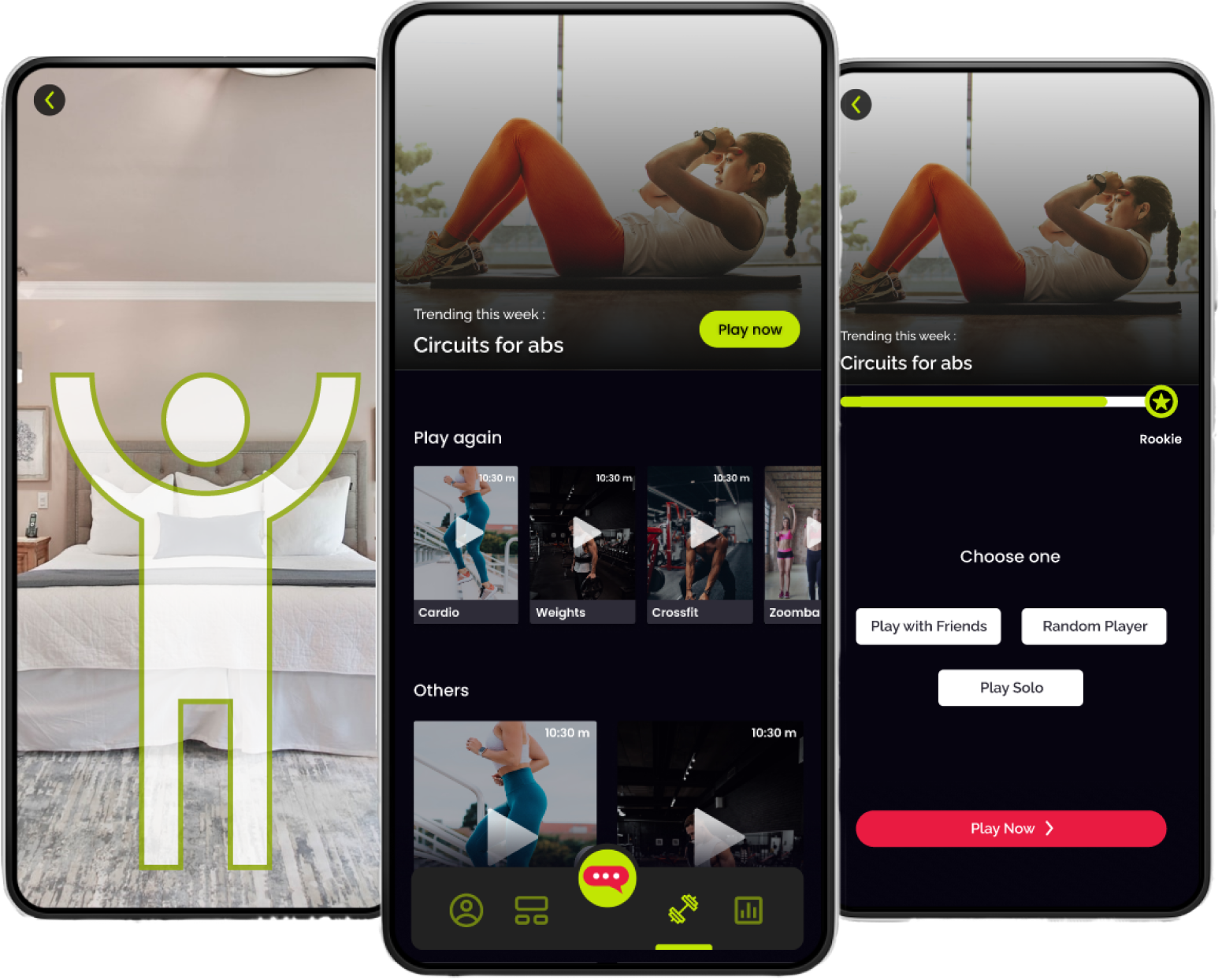 A little healthy competition motivates one to push themselves harder. This section lets the users choose their exercise of choice from a variety of exercise types. They can play solo, compete with a friend or let Gymmy pick them a random opponent.