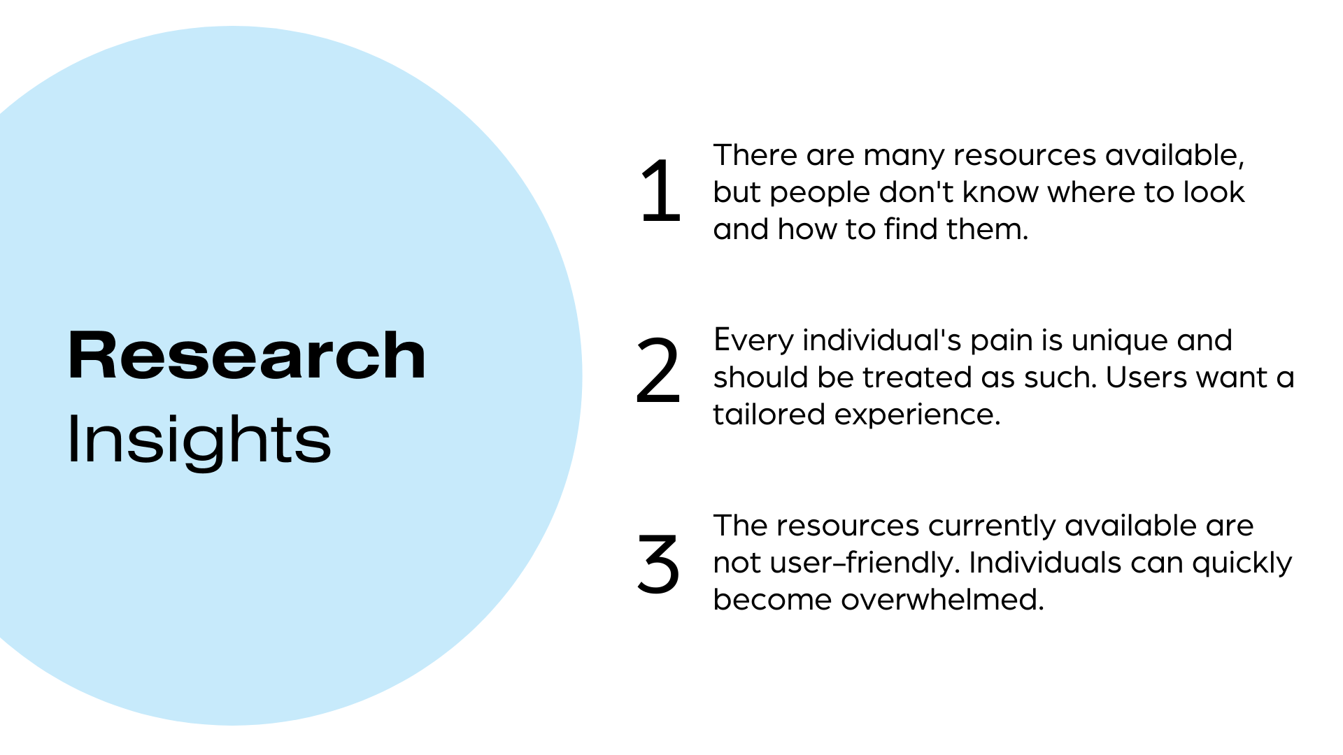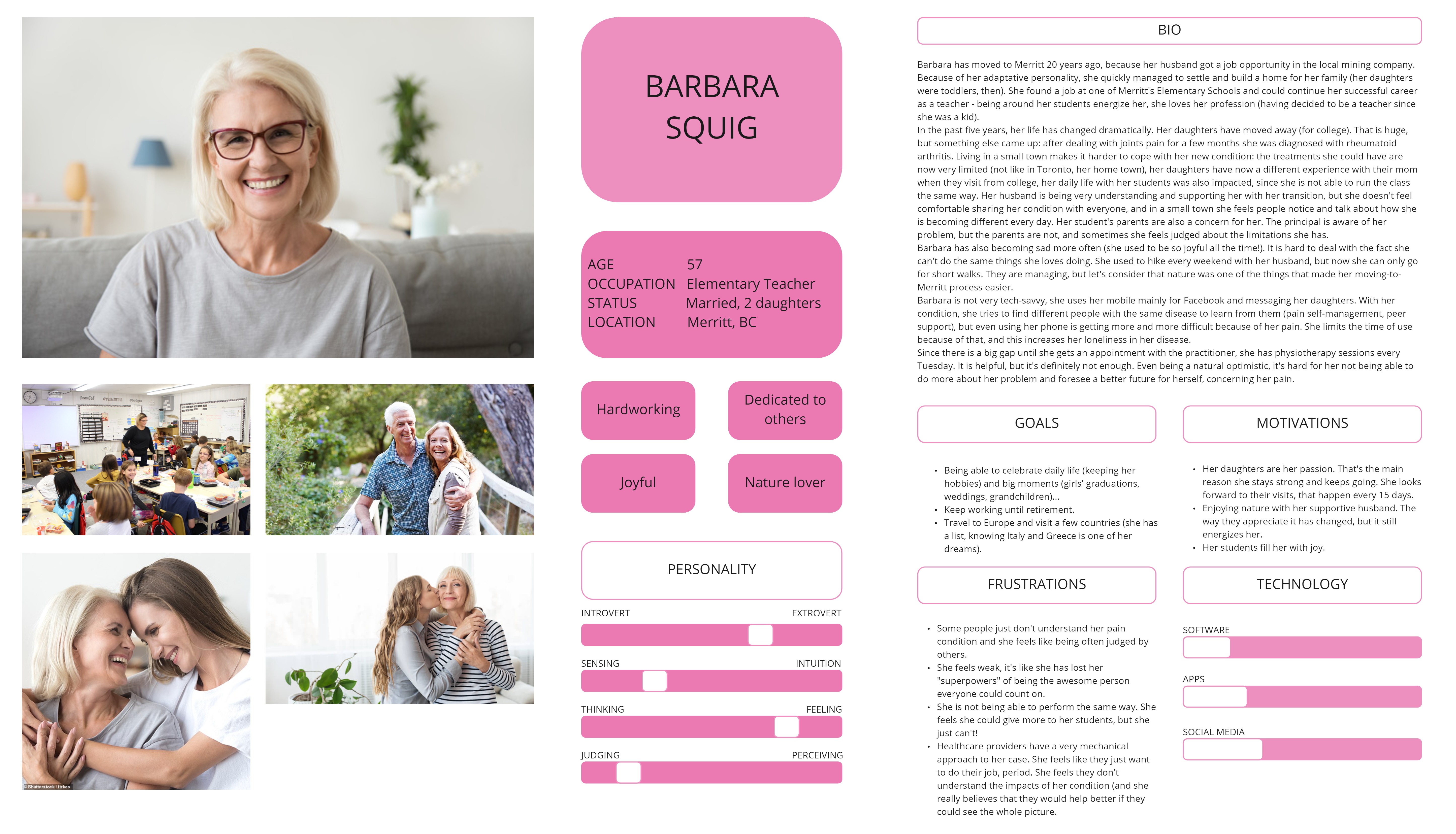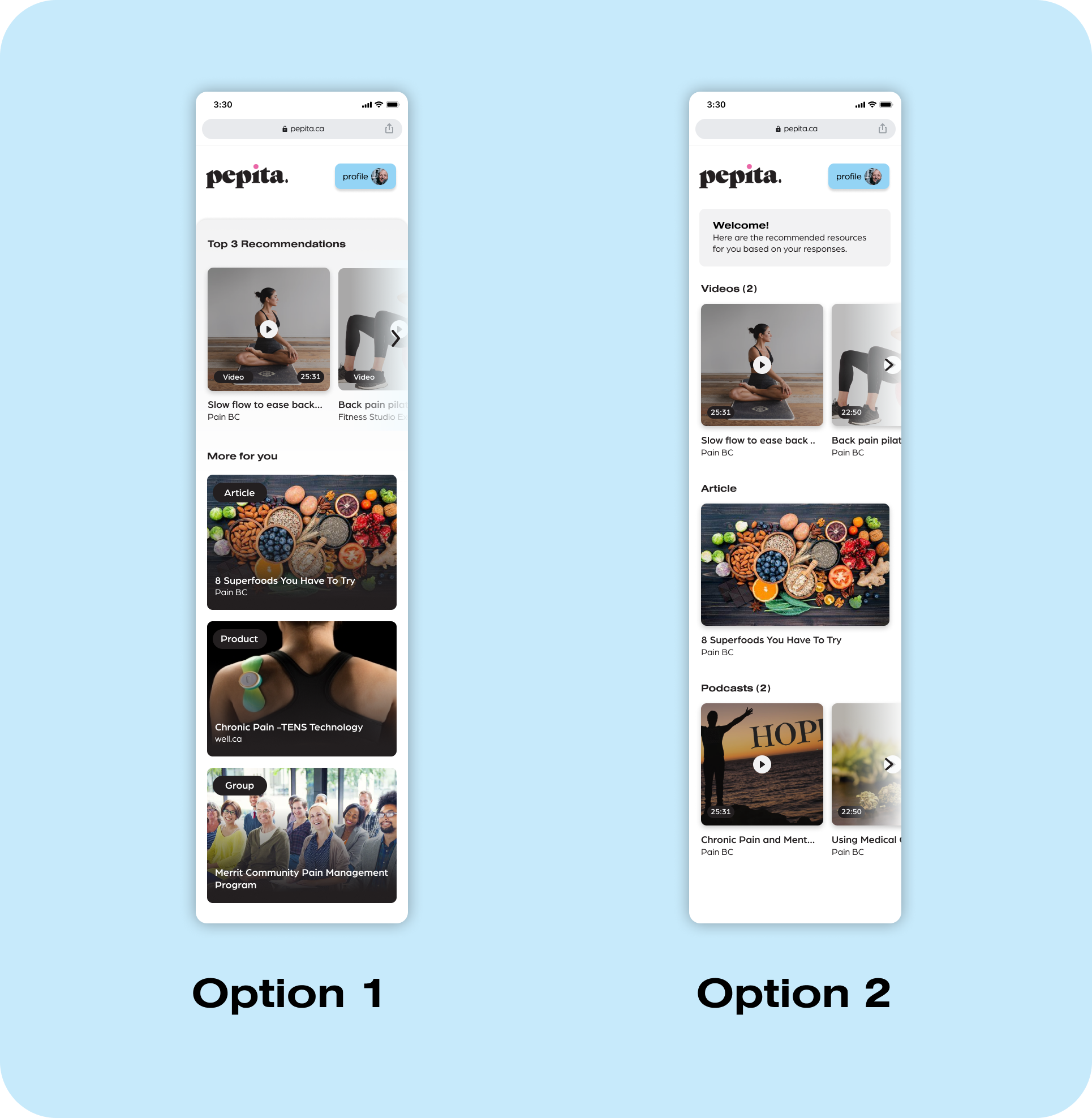 "For British Columbians living with chronic pain in rural and remote areas who need assistance to deal with their condition, Pepita is a web-based application that provides curated resources to help them. Unlike the current situation, where they have to invest a large amount of time and energy looking for resources, our product will provide personalized recommendations in a straightforward, accessible and insightful manner."
