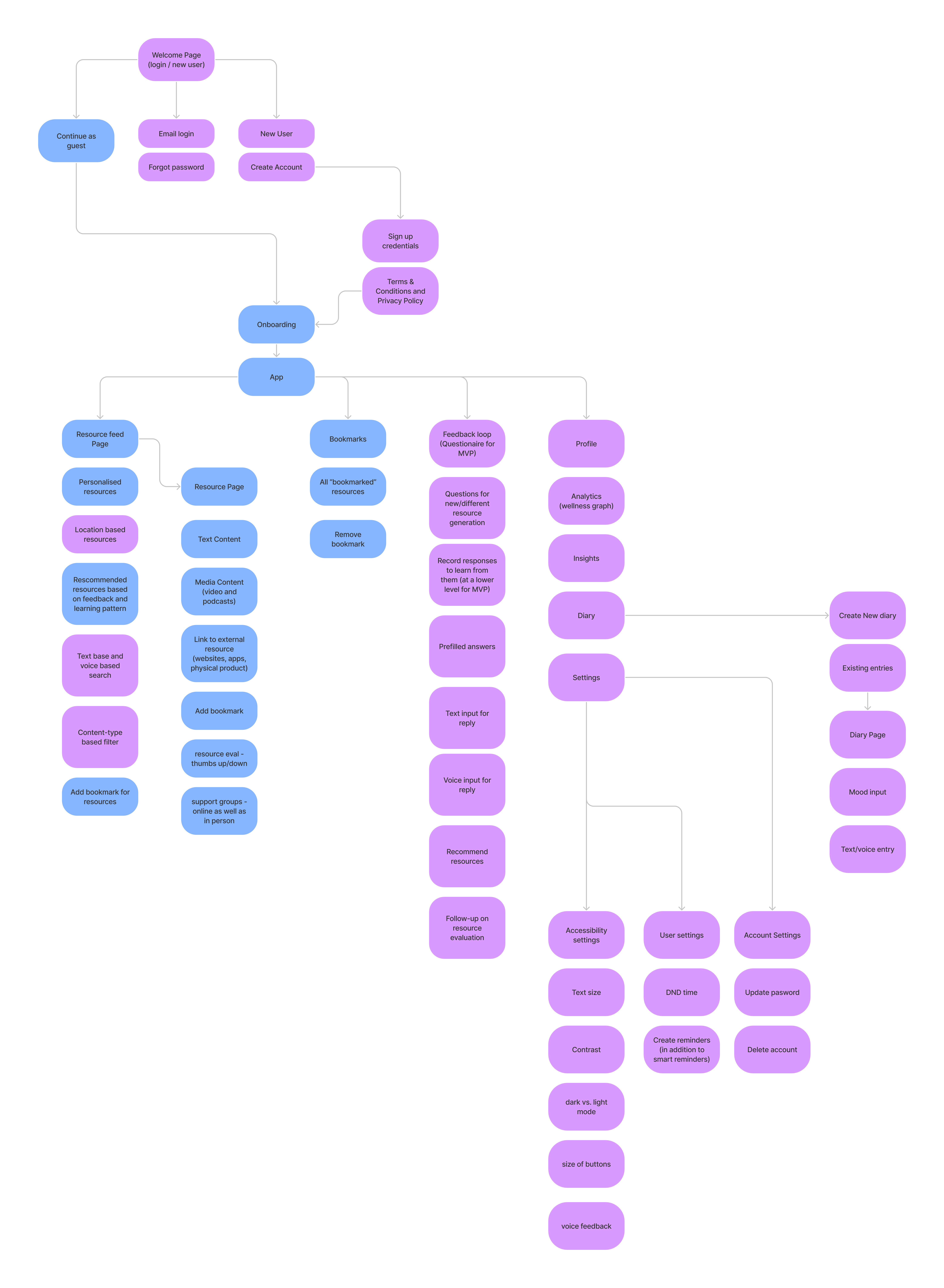I narrowed down on the features that would work together to create the intended experience. Next, I created an Information Architecture. This was to help visualize how different pieces of content would be arranged in an easily understandable way.