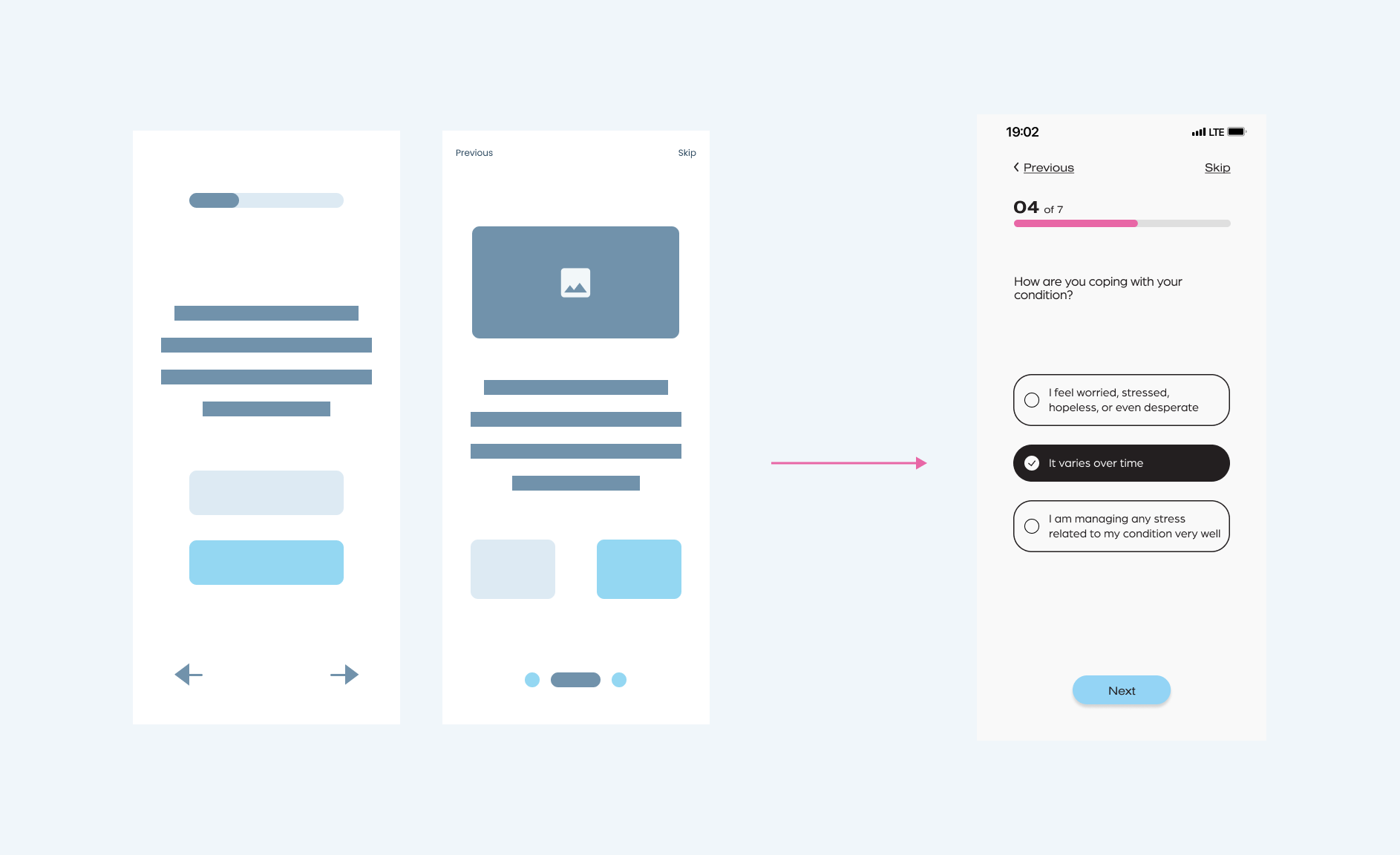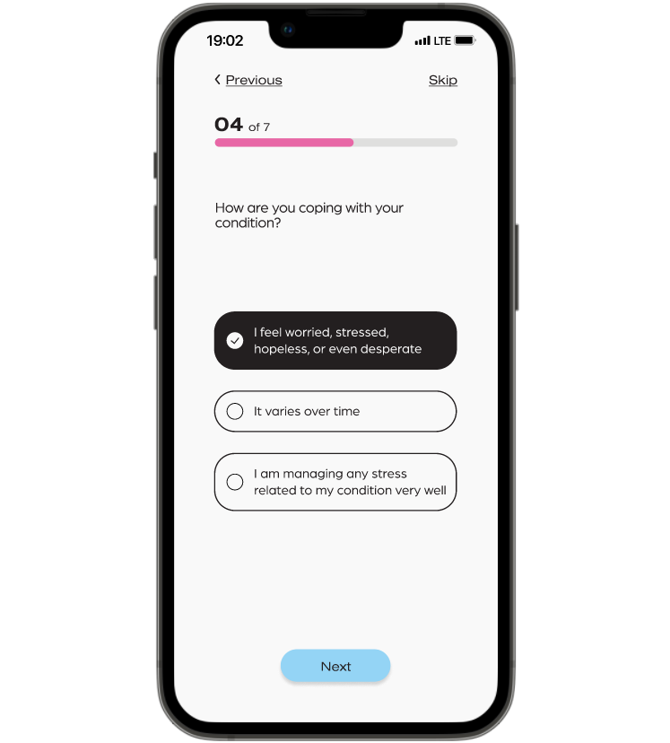 The tool starts by leading users through an onboarding experience, consisting of a brief set of questions to get an initial sense of their condition.