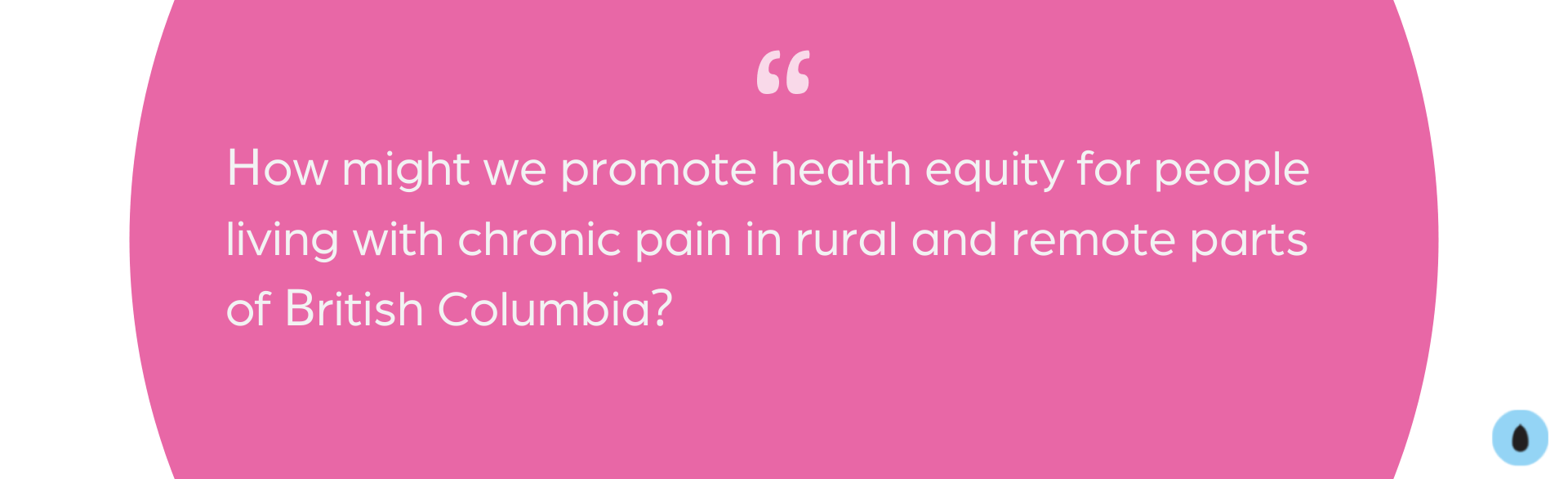 "Chronic pain is a condition that affects 20% of Canadians. People living with chronic pain in rural and remote communities in BC have inequitable access to resources that could help them improve their condition, due to such barriers as socio-economic status, distance to specialists in urban centers, lack of allied health professionals, availability of technology and other tools, limited diagnostic options, waitlists, non-attachment to primary care, and cultural safety concerns. As a consequence, people living with chronic pain are severely impacted by their condition, regarding important aspects of their lives, from physical well-being to mental health and social life."